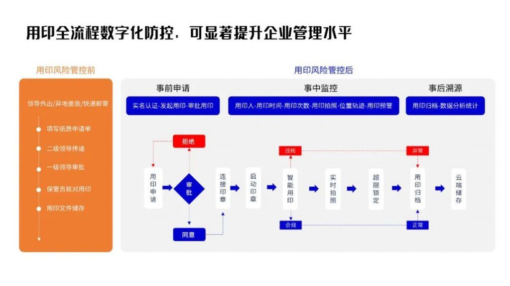 现代企业的用章场景,已经不仅仅局限在公司环境下用章盖章,在各种流动性场所、异地盖章的情况经常发生,而如果使用传统印章盖章,不仅在申请、审批效率上延迟,耽误用章时机,还容易发生被偷盖、盗用的风险问题。